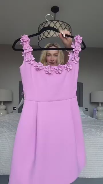 ✨This is a perfectly pink feminine mini dress crafted from crepe fabric with large floral appliqués across the front and back of the square neckline. The flowers feature faux pearl and gold-look bead detailing at the centre. This style features corset boning to the front, back, and sides of the bodice, a structured pleat-detailed skirt, and a concealed zip closure. This style is fully lined in pink satin for a smooth fit.