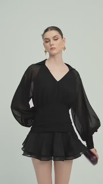 ✨Effortless sophistication meets modern allure — this mini dress is designed to turn heads. Featuring a flattering V-neckline, ruched waist detailing, and soft layered hem, it blends feminine charm with contemporary chic. The sheer lantern sleeves add a touch of romance, making it perfect for both day and night occasions.
